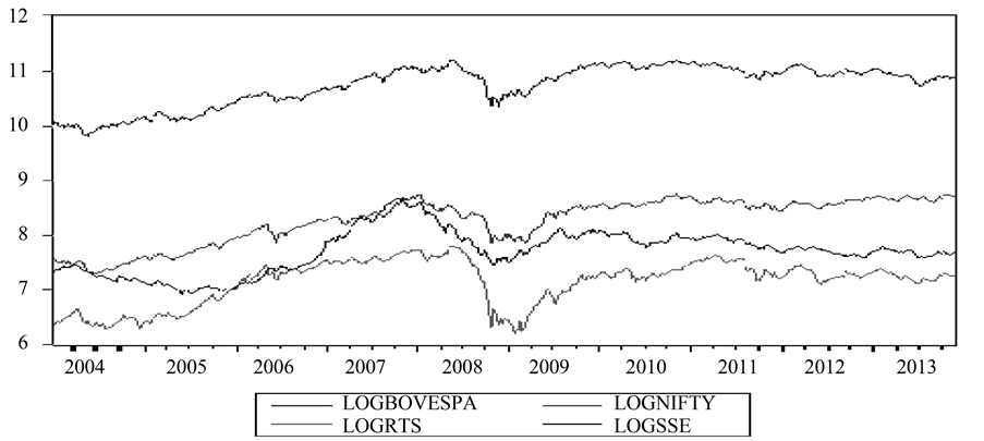 Over a period of time, China is emerging as a major trading partner among the BRIC nations and the contribution of China ranges from 72% - 85%. The trade between Russia and India is slowly increasing. Both India and China contribute approximately 80 percent or more in the imports from and exports to the all other BRICS countries during 1995-2007. Moreover, in terms of Foreign Direct Investments (FDI hereafter) Brazil, China, India and South Africa had been net importers of FDI during the period 1995-2010 whereas Russia was a net exporter in the year 2010, as studied by Mathur and Dasgupta [1] . The increasing trade relations and the financial flows from the one BRIC country to the other have made us to expect a co-movement among the stock markets of the BRIC nations. Besides this, the Morgan Stanley Capital International (MSCI) came out with an MSCI BRIC index in the year 2005, after the Goldman Sachs coined the term “BRIC” nations, keeping in view the economic conditions and similarities shared by the countries. Recently, the BRIC nations have decided to incorporate a new development bank (BRICS Bank) to finance infrastructure, developmental as well as financial safety needs among the basket countries. The creation of an index and the growing financial flows among the BRIC countries has prompted us to explore the long run co-movement among the stock markets of the nations concerned and especially during the episodes of the financial crisis. Reading in these terms, a priori one would expect a long run co-movement among all of the BRIC markets.