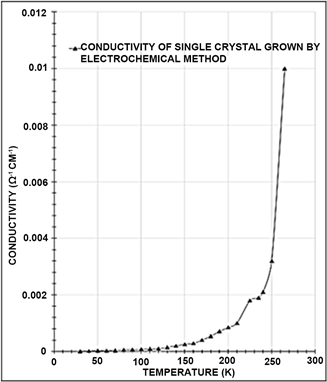 The results of this study and some of the earlier reported are summarized in Table 1. This comparison markedly indicates the high purity and much higher electrical conductivity of single crystals grown by an electrochemical method in this case. Previously electrical conductivity was observed for this complex in the range of 10−7 to 10−4 Ω−1cm−1, whereas in our case it is of the order of 10−1 Ω−1cm−1.