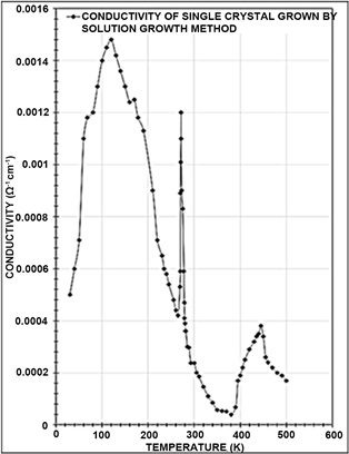 Quadruplet, black-reddish single crystal of K-TCNQ grown by diffusion method [44] in acetonitrile have shown conductivity σRT ≈ 2.41×10-4 Ω−1cm−1 at room temperature with an activation energy of 0.1 eV. This sample shows almost a similar behavior of conductivity with variation in temperature to the sample is grown by solution growth method in the range of 30 to 500 K. On starting the measurement with increasing the temperature from 30 K, initially the conductivity increases. It reaches a maximum value of conductivity 5.48 × 10−3 Ω−1cm−1 at a temperature 120 K. On further increasing the temperature, conductivity goes on decreasing and reaches a value 4.7 × 10−4 Ω−1cm−1 at temperature 265 K. The conductivity of the complex increasing again and reaches a value 2 × 10−3 Ω−1cm−1 at the temperature 271.7 K, on further increasing the temperature. Now it starts decreasing to a minimum value 4.4 × 10−5 Ω−1cm−1 of conductivity at 380 K temperature. Above this temperature, it again starts to increase up to the temperature 445 K and reaches a value 1.8 × 10−3 Ω−1cm−1. On further increasing the temperature, the conductivity decreases up to 500 K.