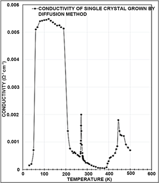 Here, it is notable that some difficulties arose during the measurement of the electrical conductivity with temperature variation in case of the single crystals. In most of the cases crystals are small, thin and fragile, so a great care must be taken in sample mounting as well as a change in temperature of the mounted sample. In case of highly conducting crystals, one has to avoid large contact resistance, so the four probe method must be used. The available crystals are small in size and Joule heating of the sample may occur at relatively low power; hence large current should not be allowed to pass through the crystals.