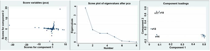 In this section, we conducted principal component analysis on four financial indicators. After principal component analysis, we extracted the first principal components as a comprehensive evaluation of each financial index. During the period of principle component analysis, the gravel figure, score figure and loading figure of each variable are shown in Figure 3.