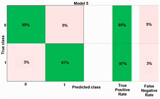 From Figure 4, we can draw the conclusion that random forest model shows the outstanding accuracy. The square of the shaded area has reached 0.99, which is close to the largest area 1. The shaded area shows the diagnosis effect. The bigger the shadow, the better the diagnosis effect. Besides, in order to verify the effectiveness of more machine learning methods, we enumerated the confusion matrix of five machine learning methods. The confusion matrix of five machine learning methods can be seen in Figure 5.