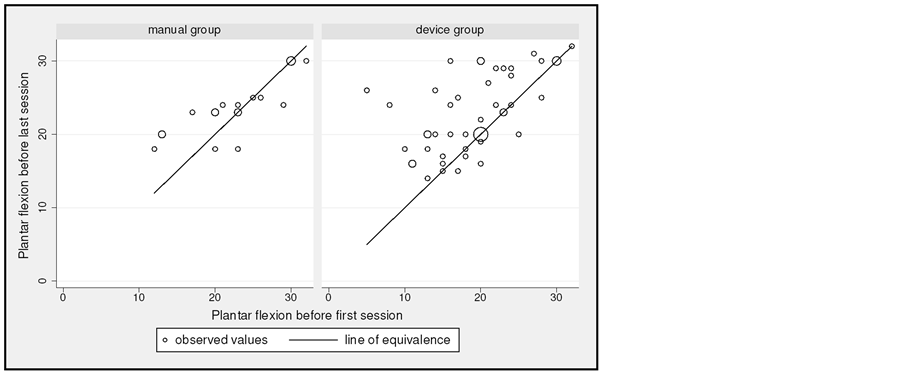 Figure 10. Degree of plantar flexion passive range of motion before first and before last session in the manual and device groups.