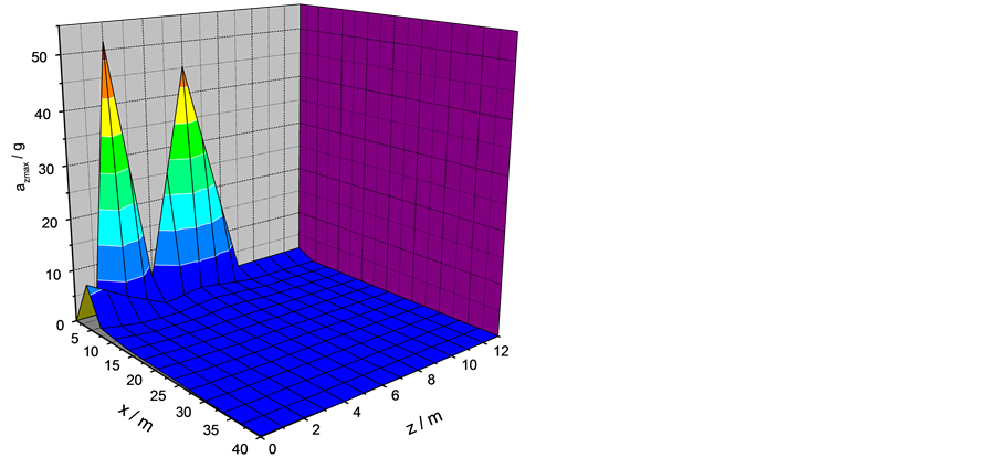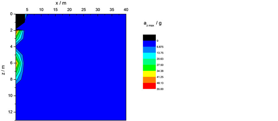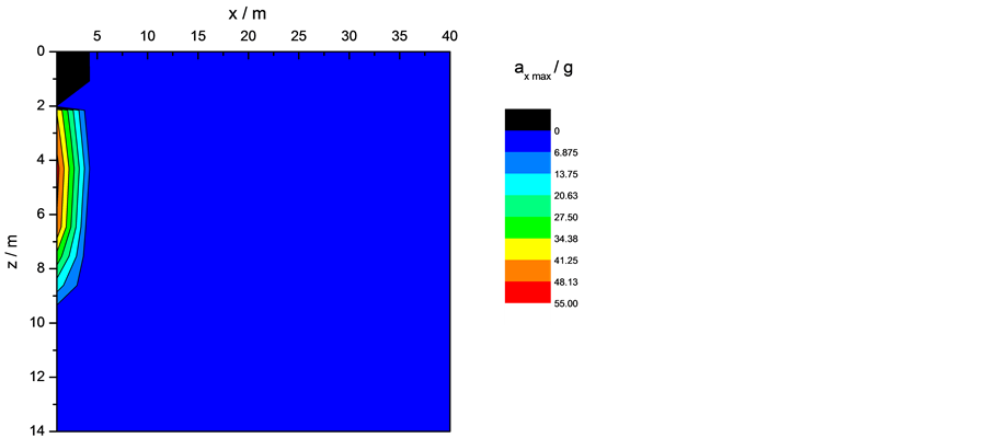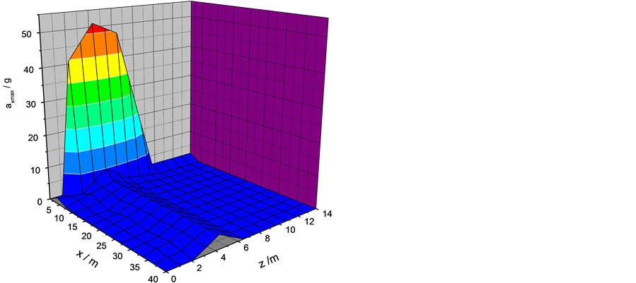 Figure 6 and Figure 7 are respectively horizontal and vertical peak acceleration color map in plane xz plane. As shown in Figure 7, the horizontal peak acceleration