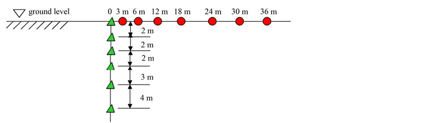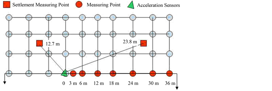 The typical location is selected to arrange acceleration sensors along vertical direction at measuring zone, which is separately 2 m, 4 m, 6 m, 9 m, and 13 m. There is an acceleration sensor in horizontal and vertical direction, as shown in Figure 1. According to the energy of dynamic compaction method, measurement range of the ace- leration sensors is 50 g and 30 g, which is made in Qinhuangdao science and technology limited company. Sig- nal gathering system G01USB32 is made in engineering mechanics research institute of earthquake bureau.
