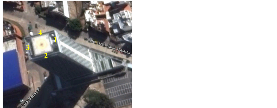 The building under study, Figure 2(a), is something more than 88 m high. The floor of the roof is placed at 81 m over the ground; it is surrounded by a parapet built of masonry 1.6 m high. Over it, an open window of 0.82 m over the top edge of the guardrail is defined all along the perimeter, just to the lower edge of a perforated metal plate 4.87 m high, that is supported by vertical tubes. A helipad is located at the center of the roof [1] .