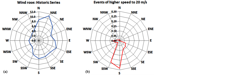The total amount of these events would be around 0.96%, equivalent to about an average of seven monthly events. Higher probability of occurrence of these winds can be seen to winds from SOUTH and SOUTH- SOUTHWEST directions, meaning 54% of possible cases of interest.