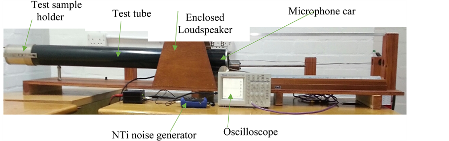 An impedance tube having a loudspeaker mounted at one end and a sample of acoustic material backed by a rigid perfect reflector at the other end is used to produce acoustic standing waves. This Standing Wave Tube of Type: 4200 and Serial Number: 878,323 is specially designed to determine the absorption coefficient of the materials at normal incidence. The loudspeaker which is fed by a NTI noise generator produces an acoustic plane wave travelling through the tube. The sound pressure maxima and minima are detected by a microphone probe tube which is led through an axial hole in the loudspeaker. The other end of the microphone probe tube is connected to a microphone inside the microphone car. The microphone is connected to a two-channel digital oscilloscope. The measurement set-up is shown in Figure 1.