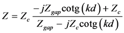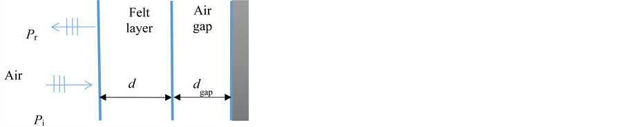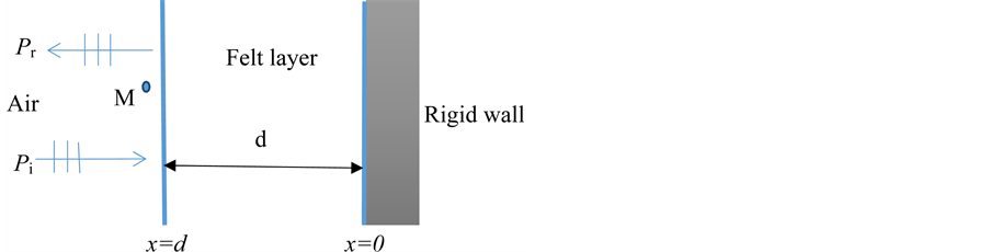 A layer of felt fixed on a rigid impervious wall is subjected to sound waves. When sound waves impinge on the front surface of the felt, a part of the sound wave reflects back into same medium while other parts propagate and attenuate through the felt. A layer of felt/unwoven material backed by a rigid impervious plane of infinite impedance at x = 0 is represented in Figure 4. The impedance at M at the surface of the felt layer is given by [22] :