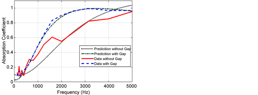 Figure 6. A comparison of predicted and measured absorption coefficient of the felt with and without air gap versus frequency.