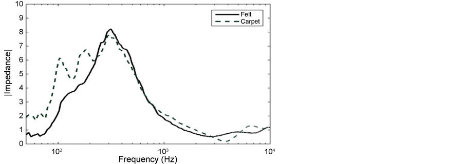 using impedance gun is presented in Figure 8. Resonance peaks have been observed at 300 Hz for carpet and at 340 Hz for felt. The impedance of carpet is higher than the impedance of felt at frequencies below 220 Hz while both impedances are in a good agreement at frequencies above 220 Hz.