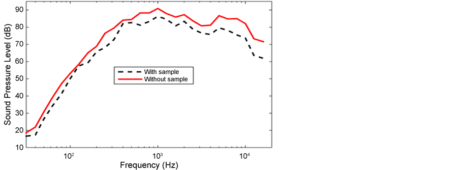 Figure 9. Sound pressure level versus 1/3 octave band frequency in the absence and presence of the sample.