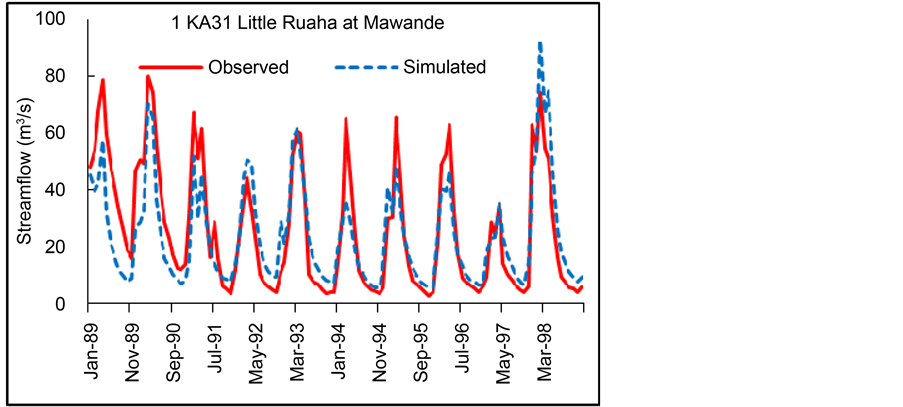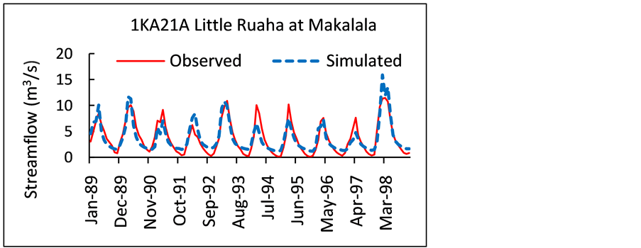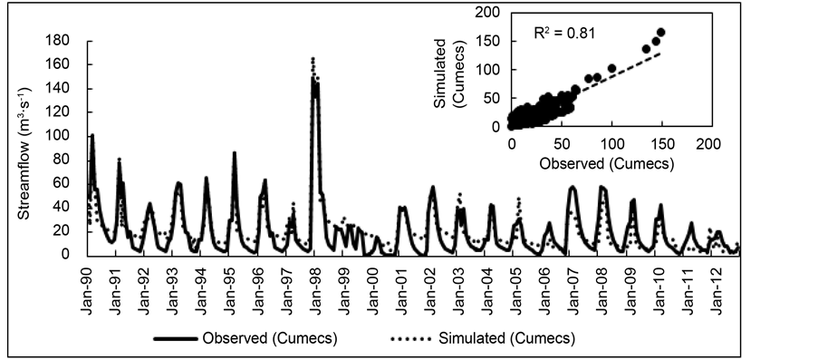 Long term simulation results for the period between 1990 to 2012 for 1KA31A (Little Ruaha at Mawande) which happens to be located in the downstream area show reasonable model prediction of streamflow with the average annual streamflow of 22.87 m3・s−1 in comparison to the observed average annual flow of 21.01 m3・s−1. The results show good agreement between the observed and predicted streamflows at the downstream outlet (1KA31A). This is confirmed by long term monthly simulation shown in Figure 5. The hydrographs show good agreement between the observed and the simulated streamflows with R2 = 0.81. As it can be observed from Figure 5 that simulated had a tendency of over-pre- dicting peak flows and under-predicting baseflow in some situations, but the general pattern seemed to be within the range of the observed streamflow.