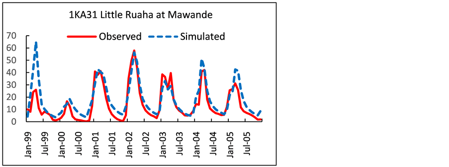 Daily calibration was conducted for the data from two sub-basins (Little Ruaha at Mawande and Little Ruaha at Makalala) for the period of 7 years from 1999 to 2005. Due to lengthy periods of data gaps, gauging station 1KA21A Little Ruaha at Ihimbu was not included in the evaluation process at daily time steps. Results of the calibration and evaluation are shown in Table 5. Results further