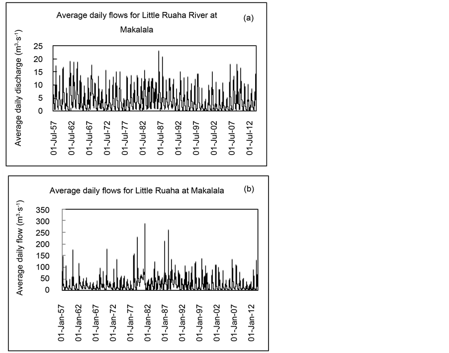 Figure 6. Time series of average daily streamflow (m3/s) for Little Ruaha River at Makalala (a) and at Mawande (b).