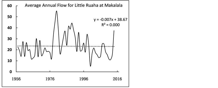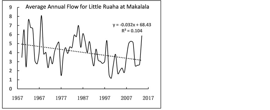 consistently increases through time, but the trend may or may not be linear. The MK test can be used in place of a parametric linear regression analysis, which can be used to test if the slope of the estimated linear regression line is different from zero. It is important noting that the other regression analysis requires that the residuals from the fitted regression line be normally distributed; an assumption not required by the MK test, that is, the MK test is a non-parametric (distribution-free) test. Thus, Table 6 presents the results of trend analyses on annual and seasonal flows Little Ruaha River at Makalala, Ihimbu and Mawande gauging stations. The Mann-Kendall test statistics (Z) on annual and seasonal flows indicate decreasing trend in river flows in the catchment. The results suggest that the flows in the Little Ruaha Catchment are changing with time.