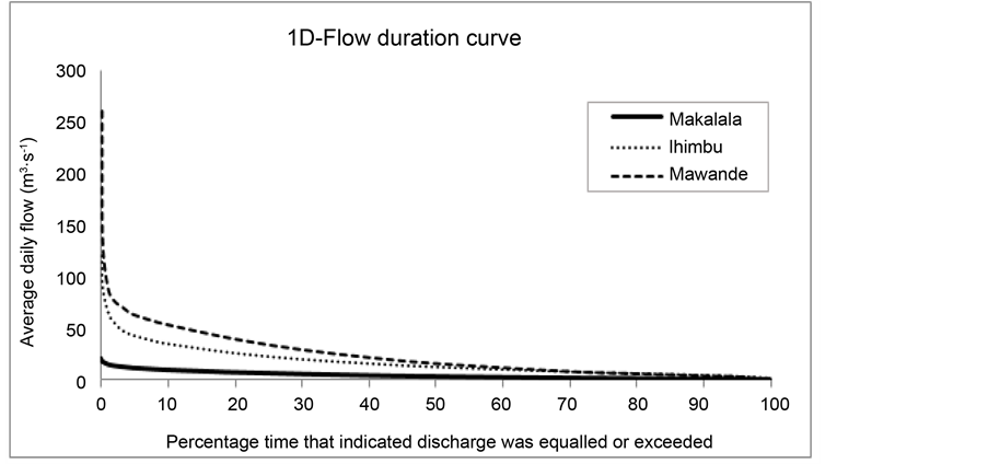 In this study the FDC percentage points were calculated from the average daily flows data after filling gaps in the time series. The daily flow duration curves at Makalala, Ihimbu and Mawande are presented in Figure 8. The general outlook reveals steep slope for high flows (say at <Q5) indicating flushing catchment. Such phenomena could be attributable to change in land use and land cover. The results further indicate that for flow less that Q95 the river is almost at bed level. This means that water abstractions must be regulated to ensure the ecological integrity of the river. An environmental flow assessment will provide more guides on how to address this requirement.