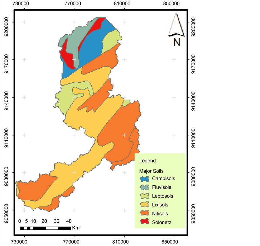 database for different soil types and profiles with important soil properties which can be extracted. Figure 2(b) shows the soil map with six major soil types domi- nant in the study watershed; Cambisols, fluvisols, leptosols, lixisols, nitisols and so- lonetz based on the FAO Classification.