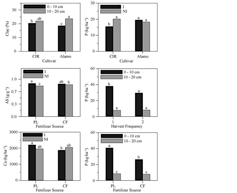 Figure 2. Soil clay content, aggregate stability (AS), and extractable soil phosphorus (P) and calcium (Ca) as affected by soil depth, irrigation [irrigated (I) and non-irrigated (NI)], cultivar [“Cave-in-Rock” (CIR) and “Alamo”], harvest frequency [one (1) harvest per year and two (2) harvests per year], and/or fertilizer source [poultry litter (PL) and commercial fertilizer (CF)]. Different letters atop bars within a soil property indicate a significant difference at P < 0.05.