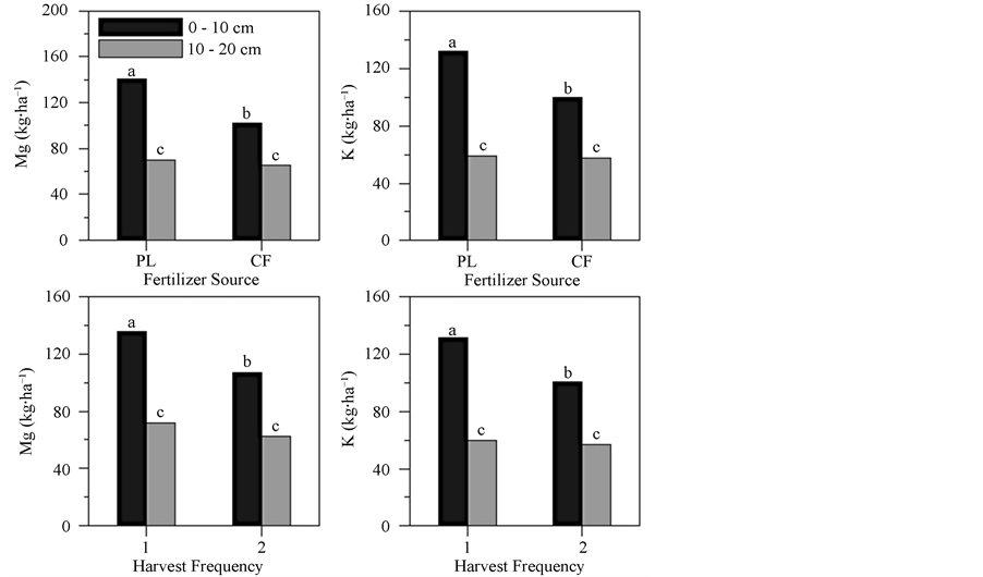Figure 4. Extractable soil potassium (K) and magnesium (Mg) as affected by soil depth and fertilizer source [poultry litter (PL) and commercial fertilizer (CF)] or harvest frequency [one (1) harvest per year and two (2) harvests per year]. Different letters atop bars within a soil property indicate a significant difference at P < 0.05.