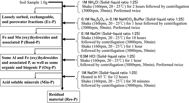One gram of wet soil was analyzed for fractionating P in chemical forms according to the sequential extraction method developed by Wilson et al. [12] , as illustrated in Figure 1, which was the modified sequential extraction procedure of Psenner et al. [13] . According to Wilson et al. [12] , P is chemically partitioned into five fractions: in order of mobility: 1) the loosely sorbed, exchangeable, and pore water fraction (Ex-P), 2) the reducible fractions, primarily Fe and Mn (oxy)hydroxides and associated P (Fe-Mn-P), 3) some Al and Fe (oxy)hydroxides and associated P, as well as some organic and biogenic P (Org-P), 4) P in acid-soluble minerals (Min-P), and 5) P in residual material (Res-P). Concentrations of P in each of the fractions were determined with the ultraviolet and visible spectrophotometer (UV-1800, Shimadzu, Kyoto, Japan) according to the molybdate-blue spectrophotometric method.