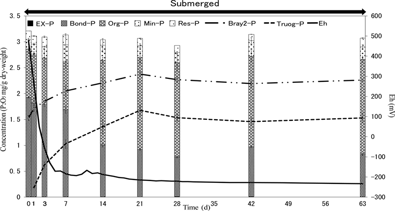 Approximately 60% of P in the soil existed steadily as Fe-Mn-P even within 7 days, which showed that more than half of P in the soil are absorbed or bound to Fe- and/or Mn-oxides. Thereafter, a comparatively steep decrease in Fe-Mn-P occurred 7 - 14 days from start of the experiment, whereas Org-P concentration increased in response to the decrease in Fe-Mn-P. This result showed the transformation in the chemical forms from Fe-Mn-P to Org-P, probably due to the transition of the soil redox status during this period. As shown in Figure 2, the value of Eh decreased drastically from 476 mV to −184 mV in 7 days; subsequently, it decreased to approximately −220 mV in 28 days. Eventually, the value was almost stable at −220 mV until the end of the experiment, which showed that the fluctuation of the redox state from the aerobic condition to anaerobic condition is completed in a week.