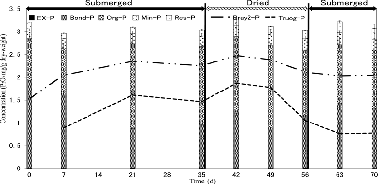 Figure 3. Fluctuations in the concentrations of each P fraction and available P with time in the incubation experiment with drainage. The concentrations of P in the soil were expressed as P2O5 mg/g dry-weight. Error bars represent standard deviation (n = 3).
