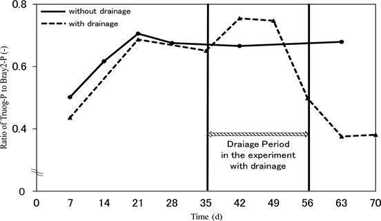 Total P (=Ex-P + Fe-Mn-P + Org-P + Min-P + Res-P) concentration in the soil appeared to be almost constant. Thus, during the incubation period, a complementary fluctuation between Fe-Mn-P and Org-P occurred, which implied that these two forms easily interconverted. The relation of the sum of the three chemical forms (i.e., Ex-P, Fe-Mn-P, and Org-P) with Bray2-P or Truog-P before the drainage were similar to those in the experiment without drainage, which confirmed that bioavailable forms were included in these three chemical forms during the submergence period even in the experiment with the drainage. However, unlike the experiment without drainage, both Bray2-P and Truog-P decreased after 7 days from the beginning of the drainage period, which indicated the decline of P availability due to drainage followed by the dryness of the soil. In addition, the extent of decrease of Bray2-P was different from that of Truog-P. As shown in Figure 4, the ratio of Truog-P/Bray2-P was constant at approximately 0.70 throughout the incubation experiment without drainage. On the other hand, the ratio decreased from 0.60 to 0.38 via the drainage (Figure 4). Moreover, the value of Truog-P was below the sum of Ex-P and Fe-Mn-P, which