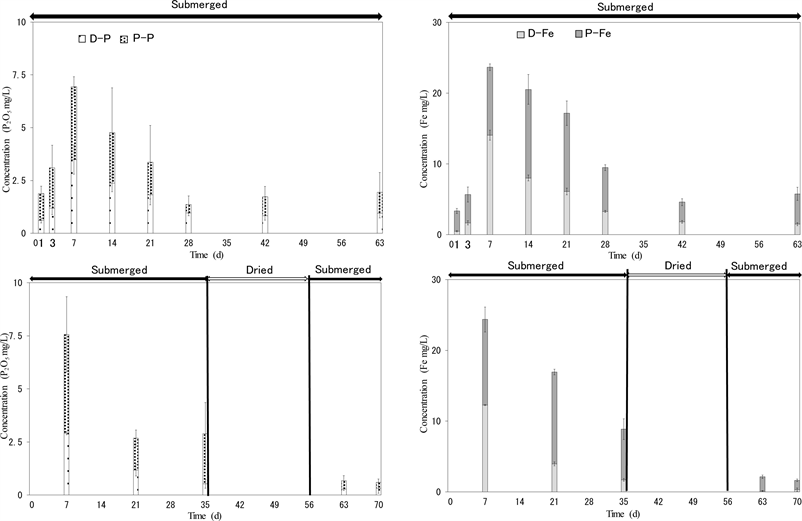 The decreases in these two concentrations probably resulted from the transformation to some insoluble forms by the combination of P and Fe. Kyuma [20] reported that dissolved Fe could be leached into the relatively oxic subsoil, where it could be re-oxidized and re-precipitated. Moreover, Fe oxides are reported to have a high capacity to bind P [21] .