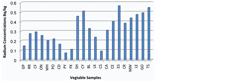 In India, Shanthi et al. (2009) [33] shows that the activity concentration of 226Ra for vegetables varies between 0.064 ± 0.03 (tomato) and 1.227 ± 0.24 Bq/kg (drumstick).