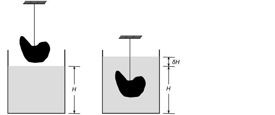 Figure 1. A fluid and an object of arbitrary shape which is denser than the fluid. (a) Before the object is lowered into the fluid, the height of the fluid is ; (b) When the object is lowered into the fluid, the height of the fluid increases by .