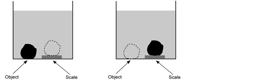 We now move the object and place it on the scale, as shown in Figure 2(b). There may or may not be fluid seepage between the object and the scale, which is immaterial. As a result, the weight of the object is added to the scale but, at the same time, the weight of the fluid in the dashed region is removed from the top of the scale. Therefore, the reading of the scale will be