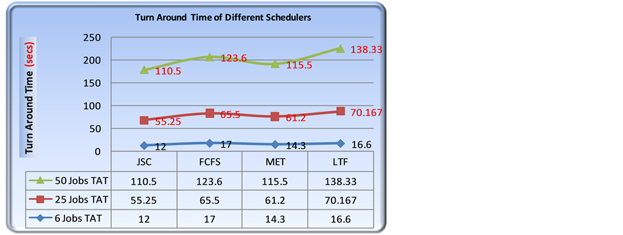 It is observed in Figure 3 that the Turn Around Time of LTF and FCFS increases with an increase in the number of jobs. When MET and JSC are compared, the Turn Around time decreases with the increase in the number of jobs, but JSC’s Turn Around Time is considerably lesser than MET Turn Around Time.