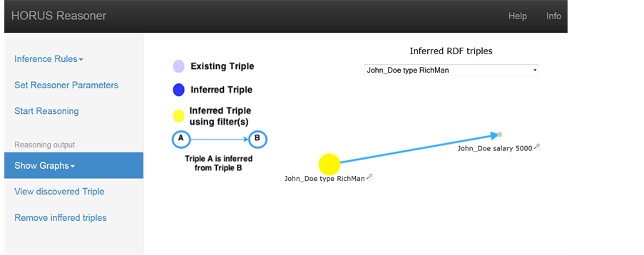 Another interesting feature of HORUS, which distinguishes it from the other existing reasoners, is the possibility to show the motivation behind each new inferred RDF triples. Two distinct and complementary visualizations have been made possible: