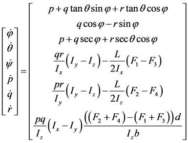 Also, by applying the force and moment balance laws, we have the following quadcopter motion formulation: