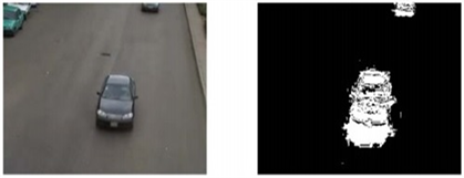 It consists of three major blocks. The first block is video image capturing and background subtraction. It consists of a stationary video camera that is placed a fixed location for capturing images. The primary task of the vehicle speed estimation method is to detect the moving vehicle from the video. A three-frame differencing technique is applied to know the motion pixels. So, the second block is the extraction of vehicle by using an adaptive background subtraction method. Here, the stationary pixels are background pixel and the moving pixels are foreground, as shown in Figure 2. This is accomplished through image enhancement (noise reduction), vehicle centroid and area calculation for getting the vehicle bounding box.