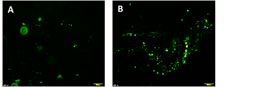 Figure 5. Fluorescein microscope images of (A) Gel sponge and (B) Gel/CTS sponge: Scale bar is 200 μm.