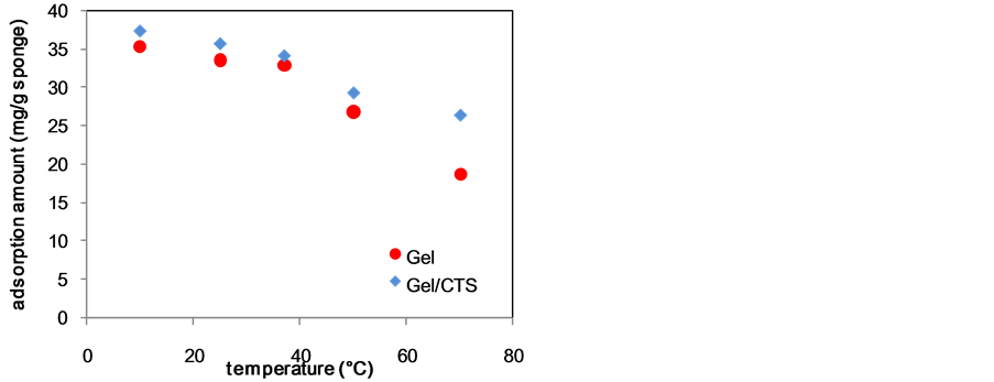 Figure 6 shows the FITC-BSA absorbed amounts for 1.8 mg/mL FITC-BSA concentration in PBS (pH 7.4) with changing temperature. For both sponges, the adsorbed amount decreased when the temperature increased; in particular, at 70˚C, the Gel sponge adsorbed a slightly lower amount than the Gel/CTS sponge.