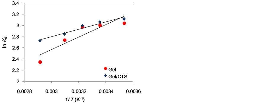 V is the volume of the solution (mL) and m is the weight of the sponge (g). ΔS˚, ΔH˚, R, and T are entropy (J/mol∙K), enthalpy (kJ/mol), gas constant (8.314 J/mol∙K), and temperature (K), respectively. ΔH˚ and ΔS˚ correspond to the slope and Y?intercept of the plot between lnKd and 1/T, respectively (Figure 7). The Gibbs free energy (ΔG) is calculated using the following well-known equation: