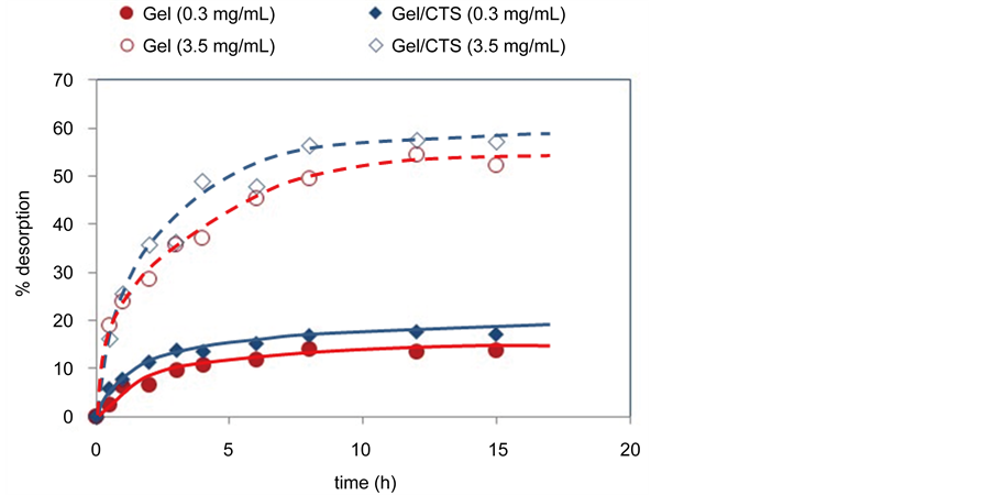 Figure 8 shows the spectrofluorometer results for the desorbed FITC-BSA in PBS at the same wavelength as the adsorption test. The initial rate of FITC-BSA release from the composite was rapid, from 0 h to 6 h, and it remained constant up to 12 h. The high adsorbed amount of FITC-BSA on sponge resulted in high desorption (in PBS at 37˚C), around 25% from 0.3 mg/mL (~0.5 mg from adsorbed amount ~2 mg) and 55% from 3.5 mg/mL (~1.5 mg from adsorbed amount ~3 mg adsorbed concentration in sponge). The Gel/CTS sponge had just little higher %desorption than the Gel sponge.