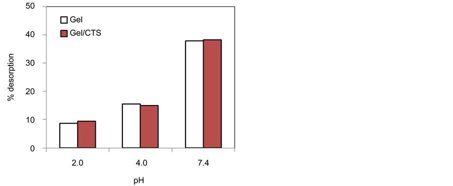 Figure 9 shows the results of pH against the %desorption FITC-BSA in PBS. For the same adsorbed amount, 1.6 mg/mL, the sponge samples were separated to test the desorption in different buffer pH solution (2, 4, and 7.4) at 37˚C, after 12 h, as measured using a spectrofluorometer. The results showed a %desorption