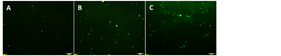 Figure 10. Fluorescein microscope images after desorption at different pH of Gel/CTS sponges: (A) pH 7.4, (B) pH 4.0, and (C) pH 2.0: Scale bar is 200 μm.