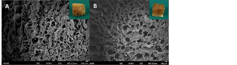 Gelatin (Gel) is a mixture of peptides and proteins produced by partial acid or alkaline hydrolysis of collagen. Gel is biocompatible and shows low antigenicity [1] , in contrast to collagen, which has greater antigenicity because of its animal origin [2] [3] . In addition, chitosan is well investigated by the biomaterial, food, and chemical industries because of its good biocompatibility, biodegradability, hemostasis, and other properties [4] - [9] . It is commonly used in nanofibers, gels, scaffolds, membranes, filaments, powders, granules, and sponges or as a composite [10] . Moreover, Gel/CTS sponges are successfully prepared for wound dressing [11] , tissue engineering [12] , bone tissue engineering [13] , and vital organ engineering [14] .