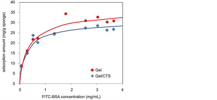 In this study, we examined Gel/CTS sponges developed by crosslinking with GlcNAc. According to the Maillard reaction, crosslinking GlcNAc and amino group produces browning compounds due to the interaction between carbonyl group, reducing sugar, and the amino compound [1] . Protein adsorption is very important in biomedical research. The interaction between the protein and surface material that occurs during adsorption can determine (a) changes in the hydration of protein molecules and the material’s surface, (b) electrostatic interaction, and (c) structure rearrangement in the adsorbing protein molecule [15] [16] . Fluorescein isothiocyanate (FITC)-bovine serum albumin (BSA) was used for protein adsorption as a model instead of a growth factor. FITC is among the simplest and most commonly used reagents for labeling proteins. The isothiocyanate group (?N=C=S) of FITC can form bonds with amino groups on proteins. Furthermore, the effect of concentration, temperature, and pH on the adsorption and desorption behavior of sponge was investigated. The adsorption constant and thermodynamic parameters were also evaluated to use the data as basic information on Gel/CTS sponges in order to apply or improve the properties of biomaterials.
