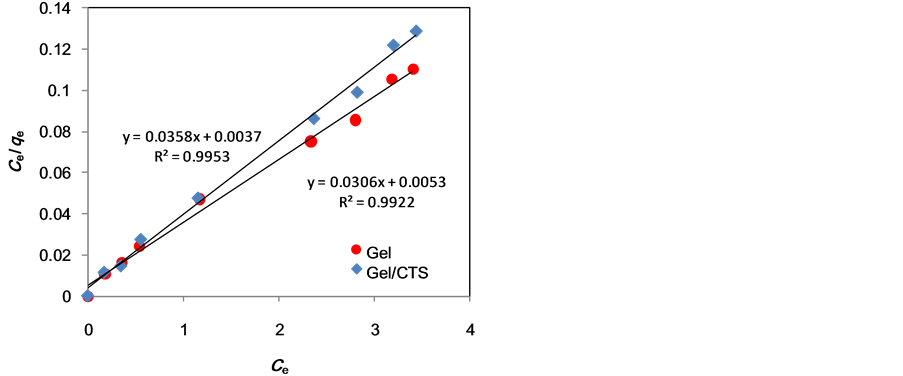 Figure 4 shows the linear correlation between Ce/qe and Ce based on the experiment data and following the Langmuir’s Hanes-Woolf plot equation. KL and qm were calculated from the slope of the plot; the value for each sponge is given in Table 1. The experimental data fit well with the isotherm in both sponges (R2 ³ 0.99). The maximum adsorption capacities (qm) for Gel and Gel/CTS sponges were 32.679 and 27.932 mg/g, respectively. The equilibrium adsorption constants (KL) for Gel and Gel/CTS sponges were 5.773 and 9.675 mL/mg, respectively. KL of the Gel/CTS sponge was greater than that of the Gel sponge, indicating more favorable adsorption on the Gel/CTS sponge, a result which was confirmed by the fluorescein microscope observations (Figure 5). Following this,