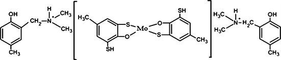 Using the Nazarenko’s method [43], we found that the molybdenum complexation form is MoO(OH)2+ [44] . Hence, the complexes can be regarded as ion associates between doubly charged anionic chelates [Mo(OH)(DP)2]2− and two protonated AP species: (APH+)2[MoO(OH)(DP)2].
