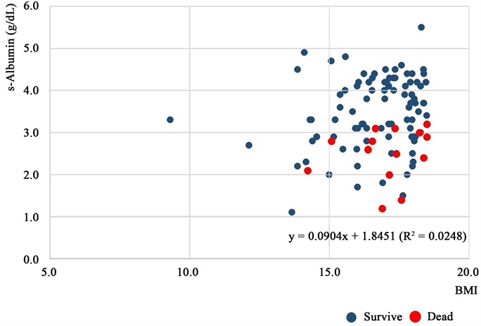 The level of serum albumin on admission varied from 1.1 to 5.5 (mean: 3.3 g/dL). No significant correlations were observed between BMI and serum albumin levels. Fourteen cases (13.2%) died within 4 weeks after admission (red dots in Figure 1).