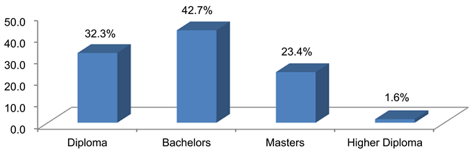 Information in Figure 2 shows that 42.7% of the respondents had a bachelor’s qualification while 32.3% had a diploma qualification.