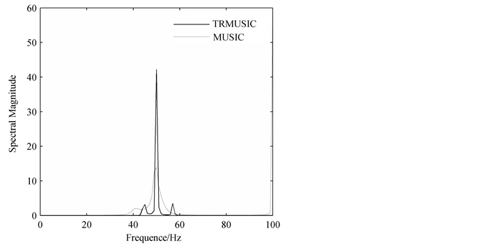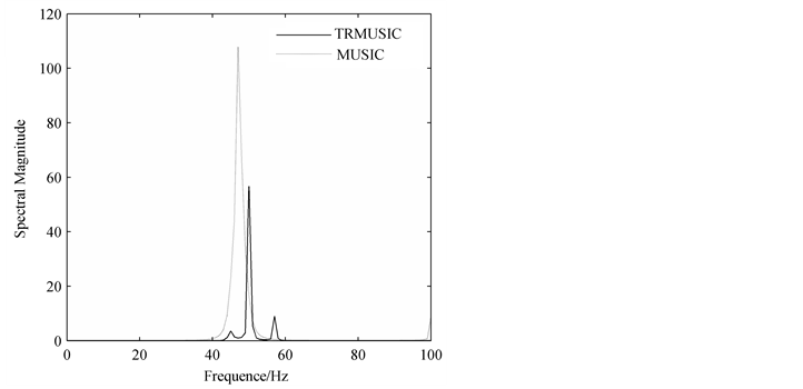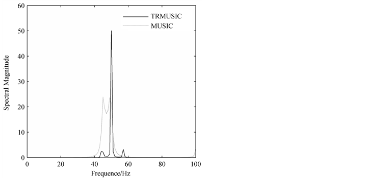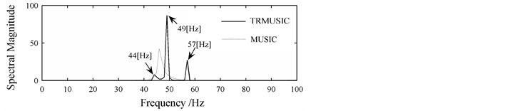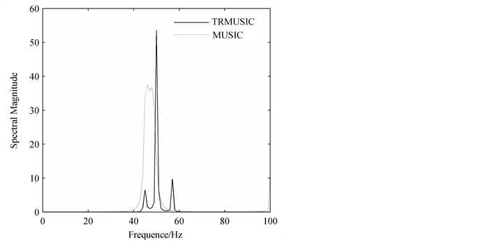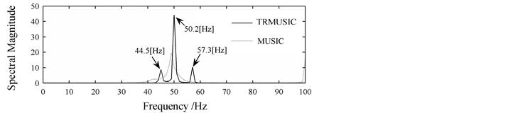 Then, the results of the TRMUSIC algorithm are compared with that of the MUSIC and DFT algorithm. For this simulation, we can see that the frequency analysis precision of the TRMUSIC algorithm is higher than that of the MUSIC and DFT algorithm, because the frequency resolution of the MUSIC and DFT algorithm is 10 Hz while that of TRMUSIC algorithm is 1 Hz, respectively. In Figure 7, when the frequencies don’t locate closest to the value of the integer frequency, the estimations with the TRMUSIC algorithm are quite accurate by predetermining the proper tunable factor