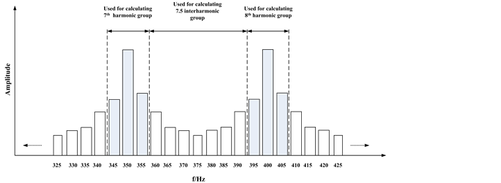 A method, which is aimed to standardize the harmonic and interharmonic measurement, has been proposed by the IEC [2] . This method utilizes discrete Fourier transform (DFT) performed over a rectangular time window of exactly 10 cycles for 50 Hz power systems. The window width fixes the frequency resolution at 5 Hz, so the interharmonic components that are between the bins spaced of 5 Hz would spill over primarily into adjacent interharmonic bins with a minimum of spill into harmonic bins. Therefore, the harmonic and interharmonic groups are introduced. The interharmonic group is defined as the RMS (Root- mean-square) value of all the interharmonic components between adjacent harmonic groups (see Figure 1).